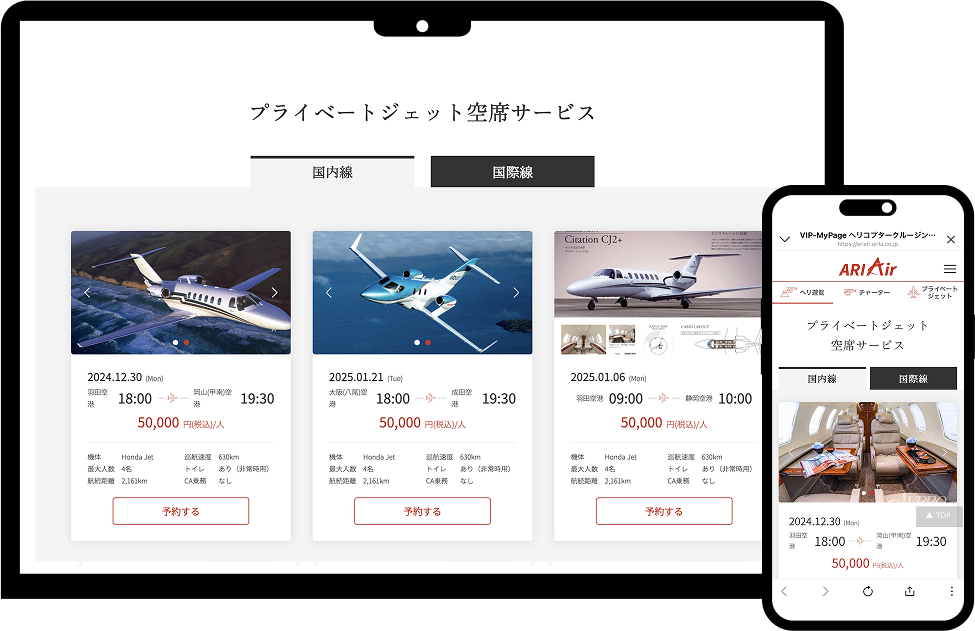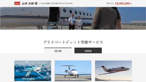日本全国、全世界で毎日発生する「乗客のいない回送便」を会員様向けに特別価格の最大95%OFFでご提供。<br>通常のプライベートジェット利用も割引料金でご利用いただけます。
