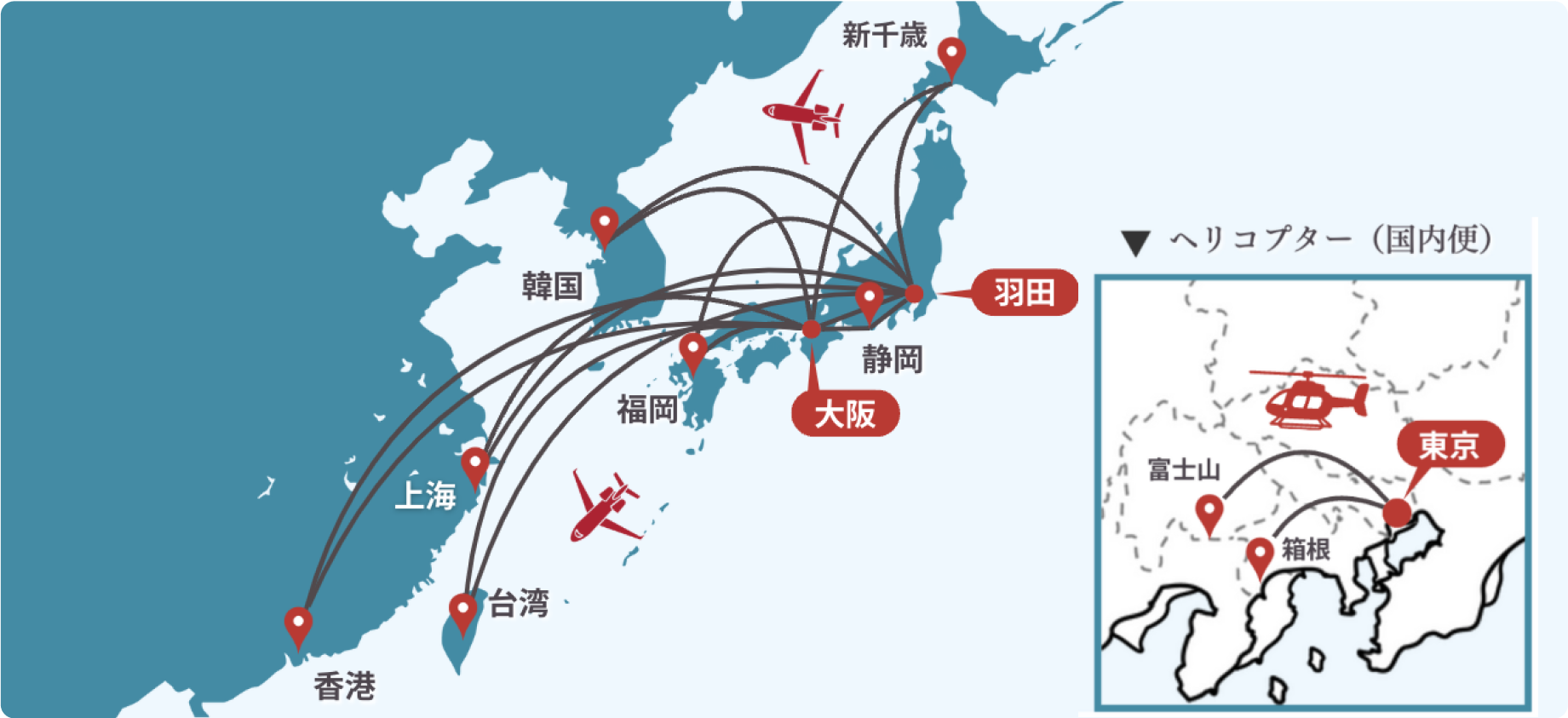 ヘリなら空港のないエリアへもアクセス可能。箱根・阿蘇山・富士山などへもスムーズに移動。